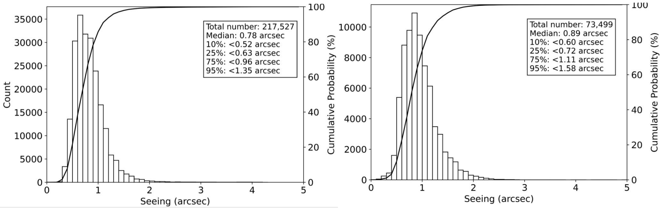 ?左图:慕士塔格观测站北1点6米高度视宁度统计图;右图:慕士塔格观测站北2点10米高度视宁度统计图?