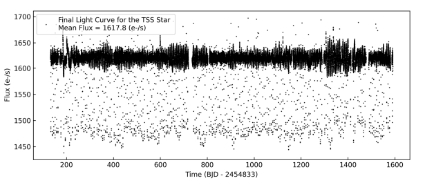 研究人员利用像素级光度建模、质心漂移测量以及与Gaia DR3目录的交叉匹配,锁定信号并确定其来自一颗位于KOI-1755左侧的背景食双星。通过精细建模和去污染处理,直接从TPF数据中分离出这颗背景星的无污染光变曲线,确认其为一对周期约6.14天、由两颗矮星组成的食双星系统(见图1)。